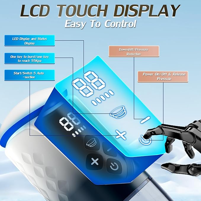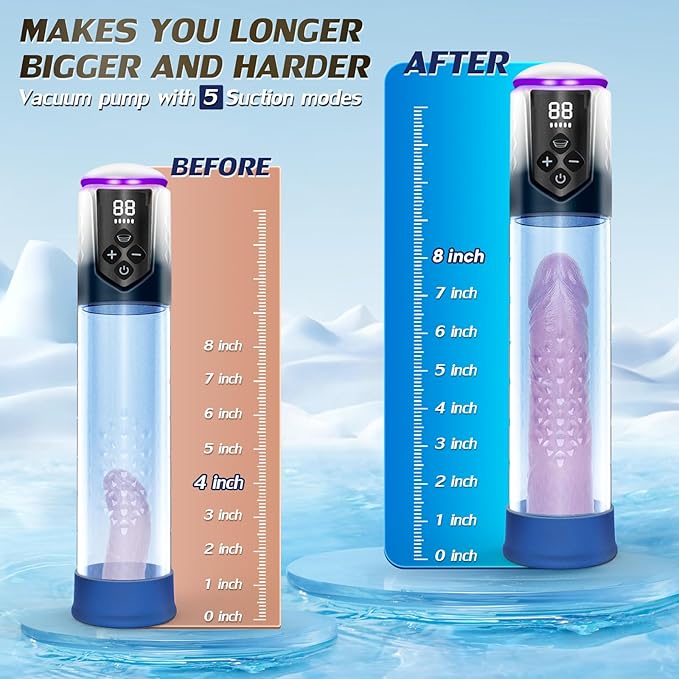 Transform your manhood with this advanced 3-in-1 penis pump featuring 5 auto suction modes and 5 training pressure levels. Use it as an automatic male masturbator or for serious enlargement training. The LCD touch display puts control at your fingertips. Includes hot/cold temperature therapy (10°C–40°C) to boost blood flow and sensation. USB rechargeable with 1-1.5 hours runtime. IPX7 waterproof.